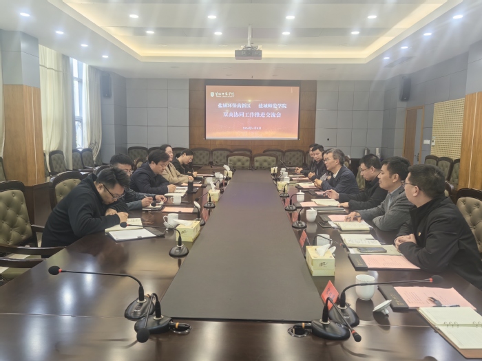 4月8日上午,盐城环保高新区党工委副书记郭宗标一行来我校就“双高协同”试点工作推进情况进行专题交流。学校党委副书记于建江出席会议并讲话。