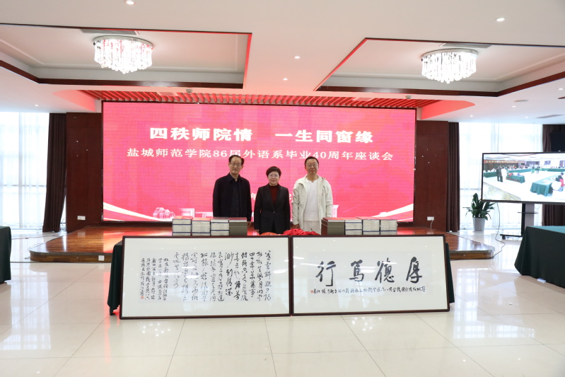 座谈会上,薛家宝、曹寿康、钱华英、袁一生等班主任和任课教师代表通过线上线下方式深情回忆了与同学们朝夕相处的点滴,并寄语校友们永葆初心、赓续荣光,常回母校看看。外语86届校友马志和、陈平、戈红兵、吉莉等校友代表分别作交流发言,分享四十年来的奋斗历程与人生感悟,感恩母校培育之情。与会校友向母校和外国语学院赠送书法作品、史志成果,并向到场教师敬献鲜花,表达深切谢意与美好祝福。