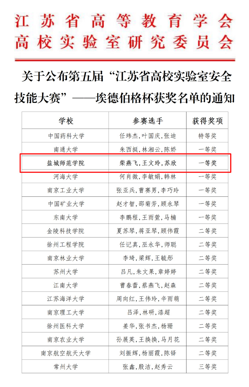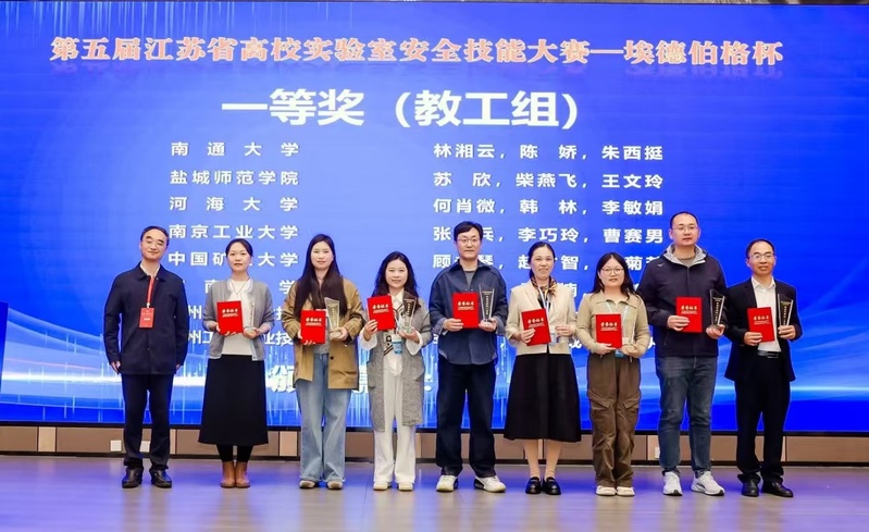 4月9日,2026长三角地区高校实验室工作高质量发展大会在南京召开,表彰第五届江苏省高校实验室安全技能大赛获奖单位和团队。盐城师范学院由实验室管理处苏欣、柴燕飞及药学院王文玲3位老师组成的代表队,在全省74所高校、333名参赛师生中脱颖而出,荣获一等奖,实现在该项赛事中一等奖零的突破。