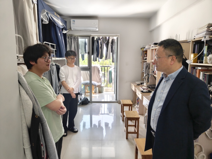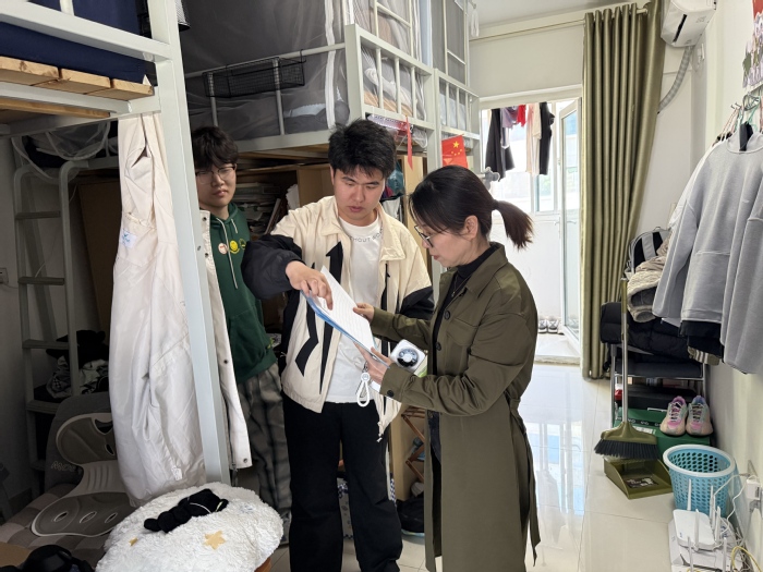 走访中,吕荣冠一行逐一检查各间宿舍,详细询问日常作息、学习状态和生活需求,倾听学生困惑与建议。围绕宿舍卫生、用电安全、防火防盗和学风建设等方面情况,吕荣冠一行叮嘱同学们养成良好卫生习惯,提高防护意识,共同营造文明居住环境,并鼓励学生积极参与各类活动,营造勤学笃行的宿舍学风。
