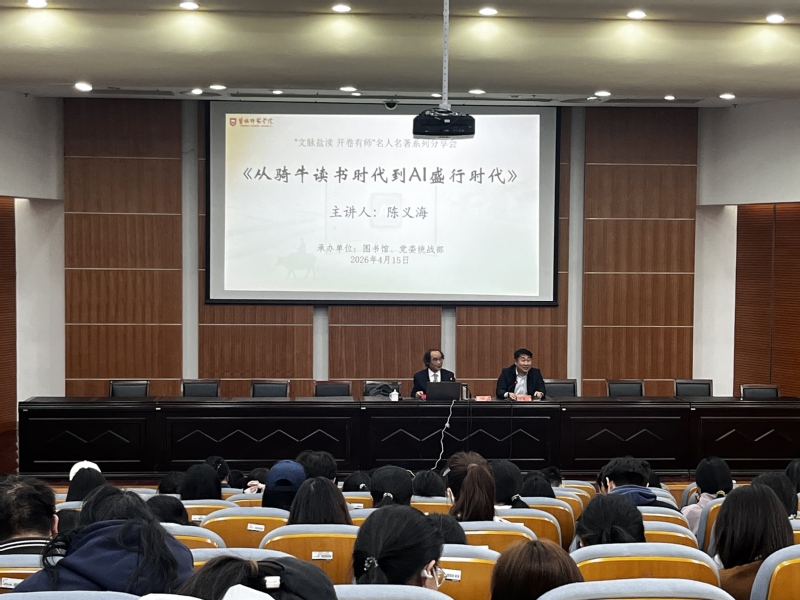 4月15日,图书馆联合党委统战部举办读书节系列活动之“文脉盐渎 开卷有师”名人名著系列分享会首场讲座。我校阅读推广大使、原文学院院长陈义海教授应邀作题为《从骑牛读书时代到AI盛行时代》的专题讲座。